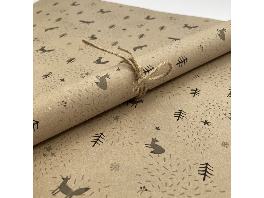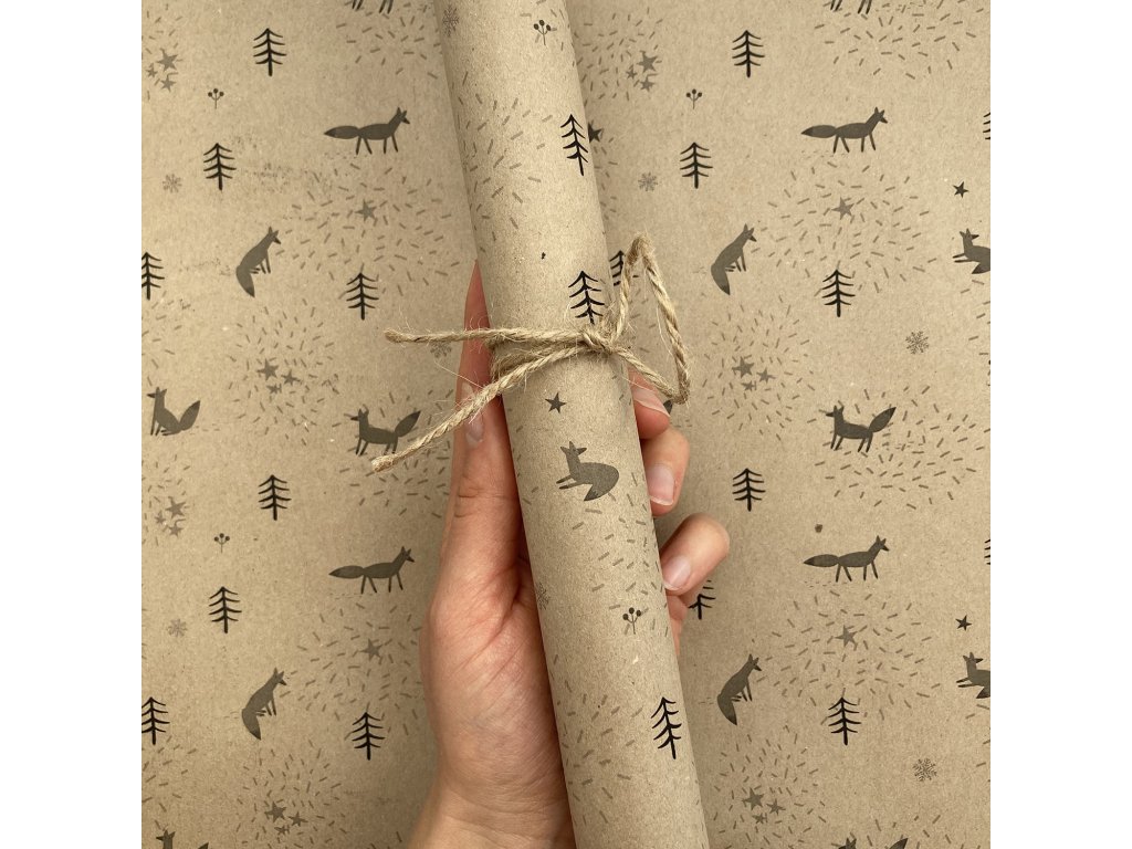 Balicí papír s motivem lišek. Tištěno na recyklovaném kraftovém papíru.