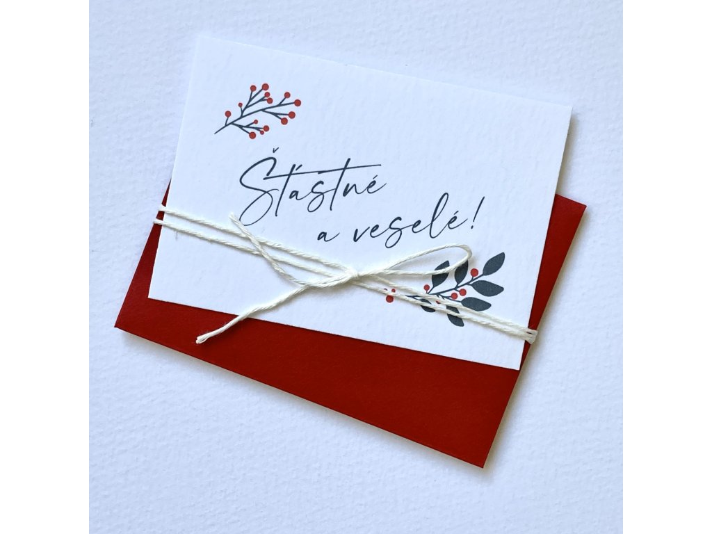 malé přání s motivem cesmíny. Jednoduchá karta s rovnými okraji s textem “Šťastné a veselé!”. Doplněno o červenou obálku.
