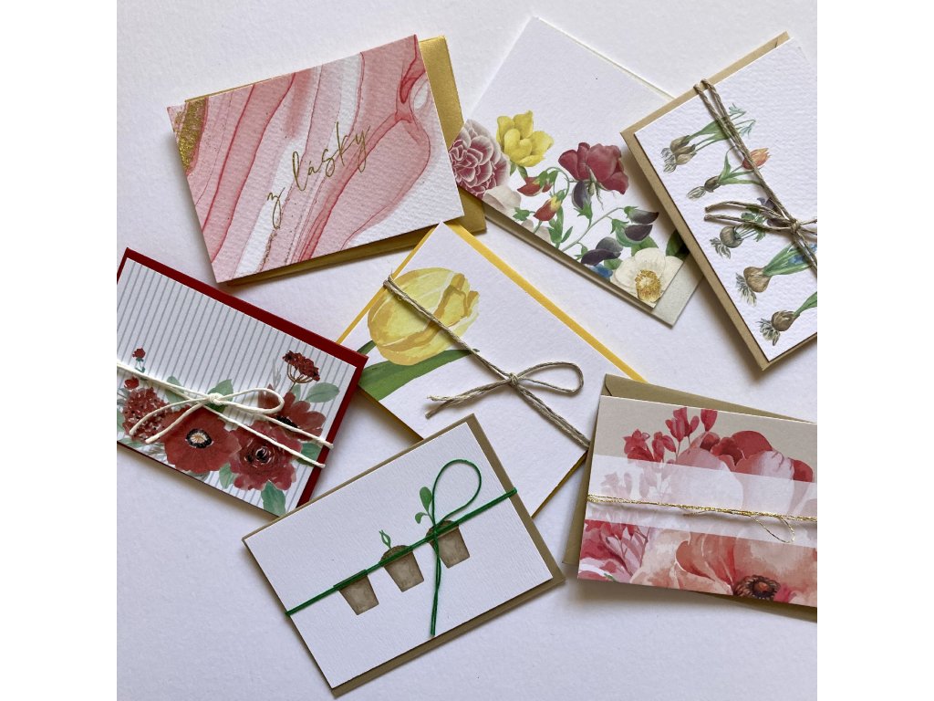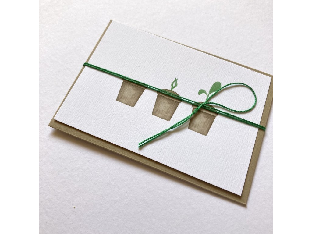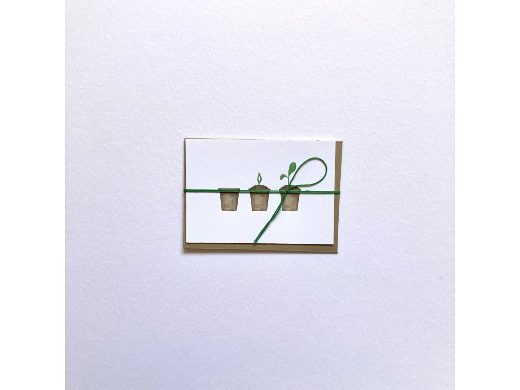 malé přání s motivem květníků. Jednoduchá karta s rovnými okraji bez textu, převázaná zeleným provázkem. Barevná obálka.