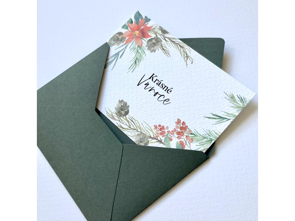 Malé přání s motivem jehličnatých větviček. Jednoduchá karta s rovnými okraji s textem “Příjemné prožití vánočních svátků”. Doplněno o zelenou obálku.