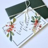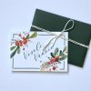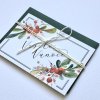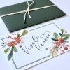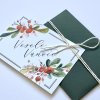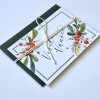 Přání s motivem jmelí. Jednoduchá karta s rovnými okraji s textem “Veselé Vánoce”, převázaná bílým provázkem. Doplněno o barevnou obálku.