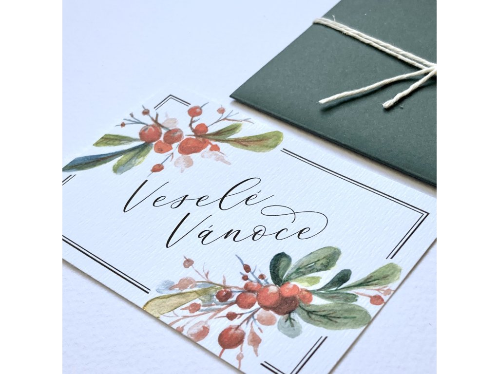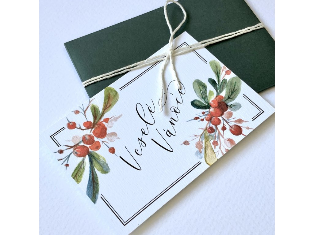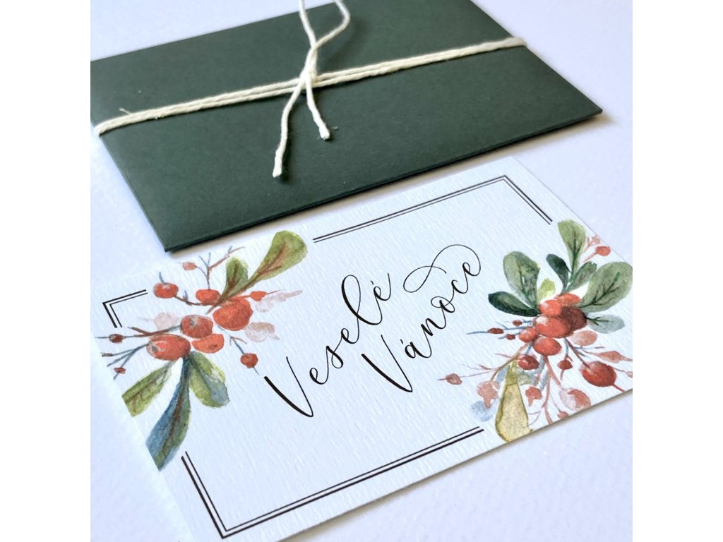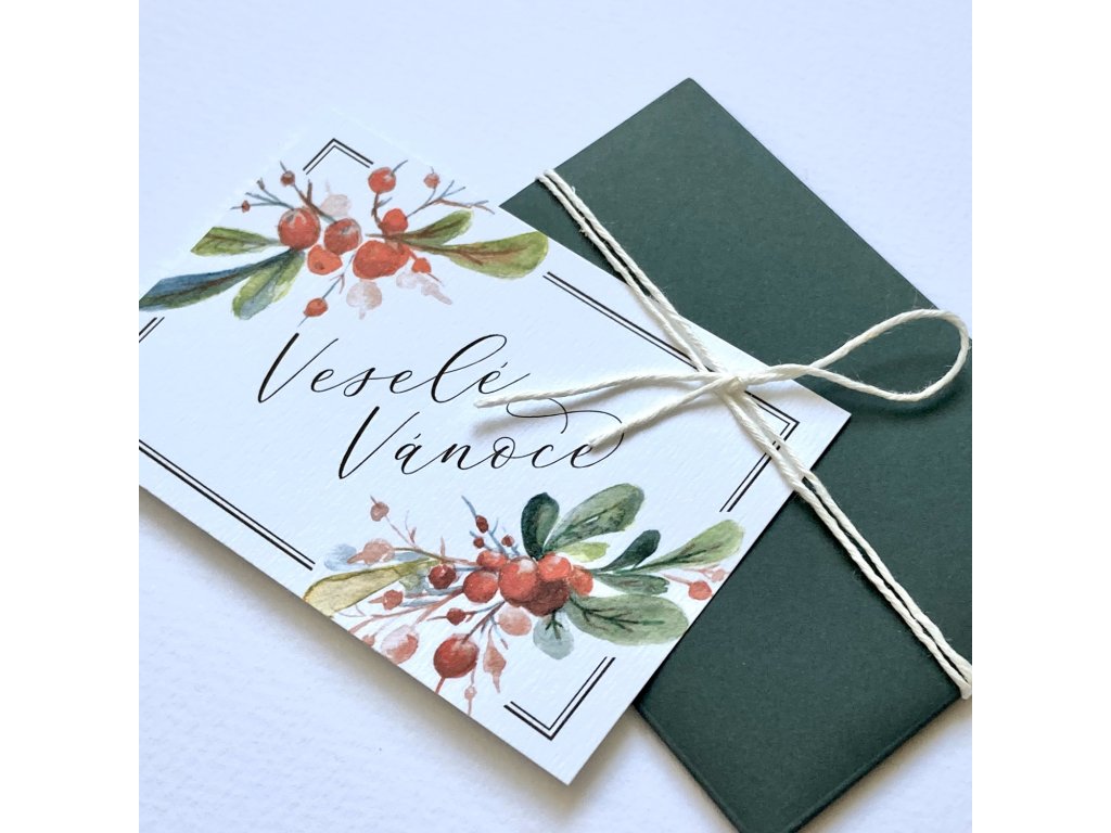 Přání s motivem jmelí. Jednoduchá karta s rovnými okraji s textem “Veselé Vánoce”, převázaná bílým provázkem. Doplněno o barevnou obálku.