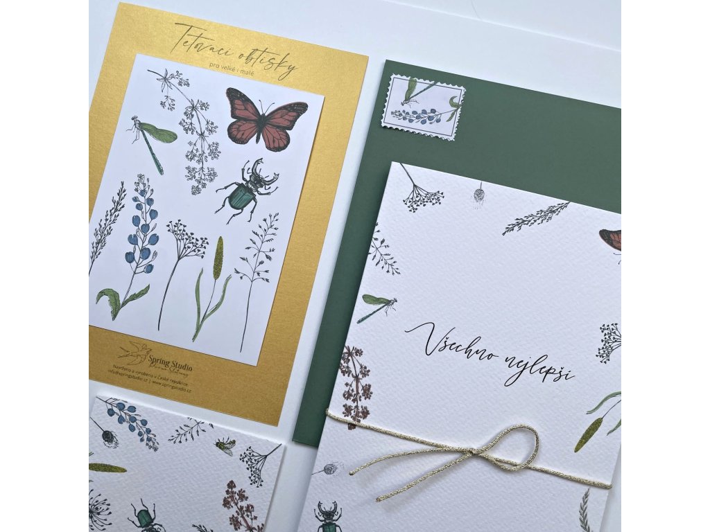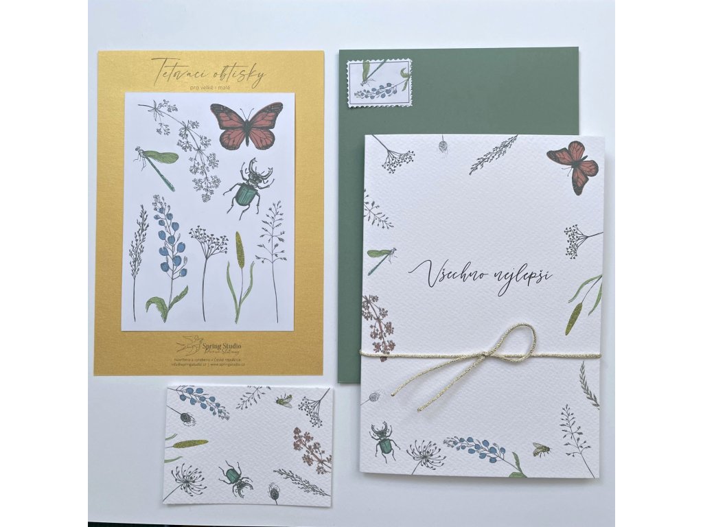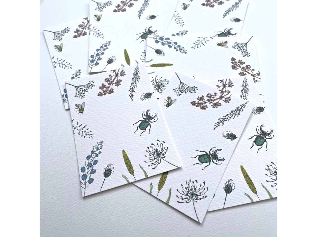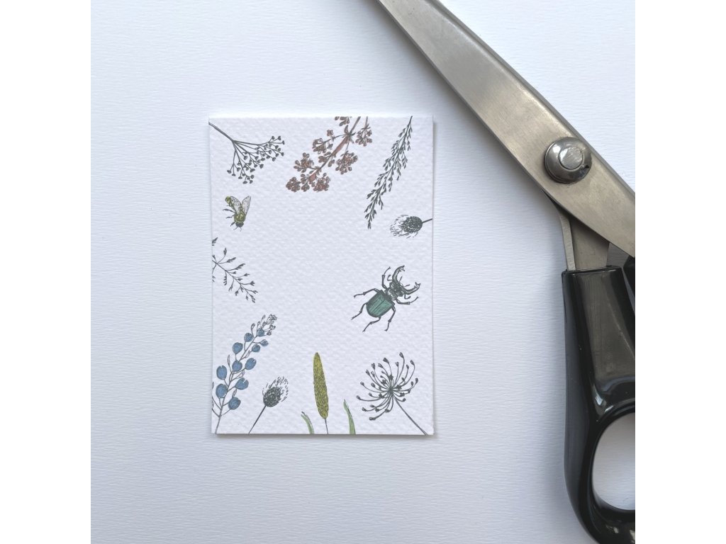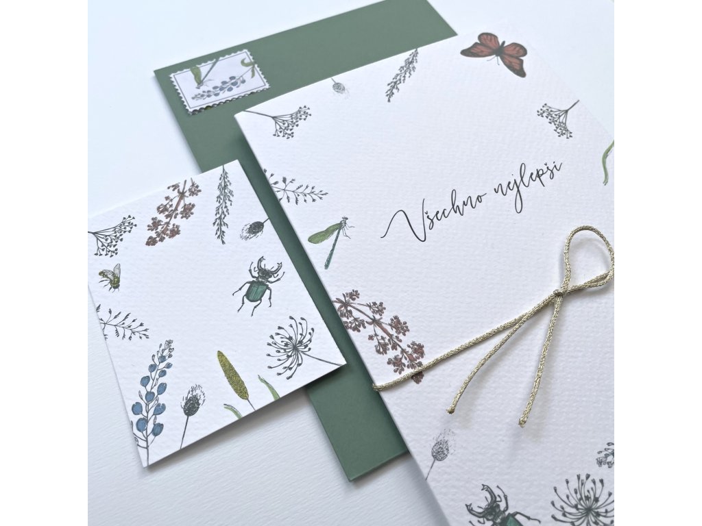 malé přání s motivem lučního kvítí a hmyzu. Jednoduchá karta s rovnými okraji bez textu. Barevná obálka.
