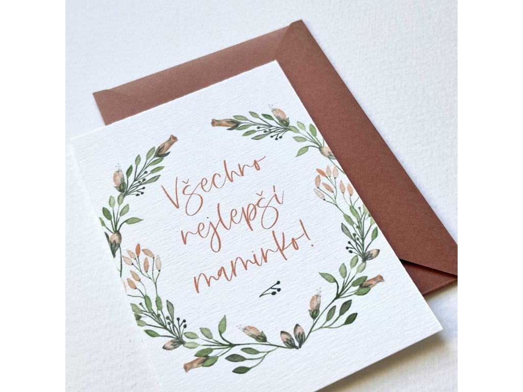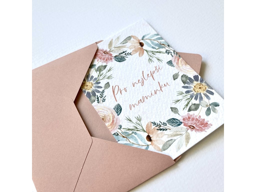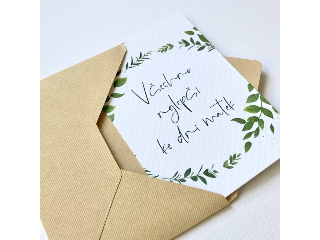 malé přání s různými motivy. Jednoduchá karta s rovnými okraji s textem "Krásný den matek", "Pro nejlepší maminku", "Všechno nejlepší ke dni matek", "Mamince", "Všechno nejlepší maminko". Barevná obálka.