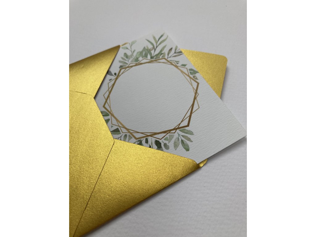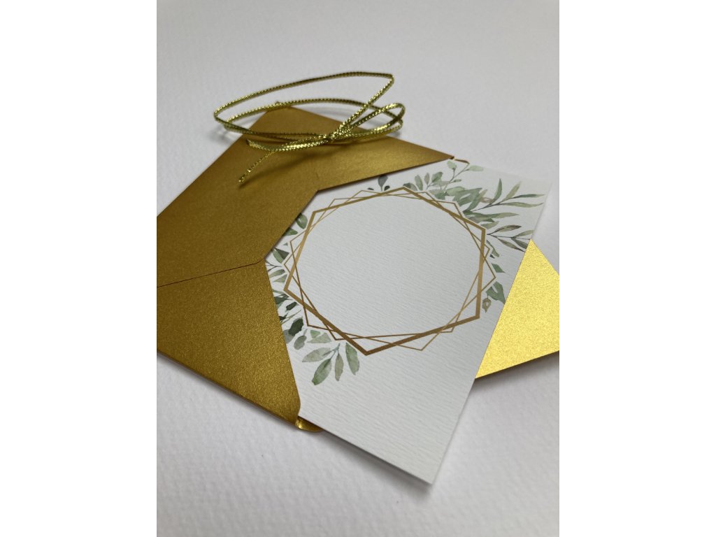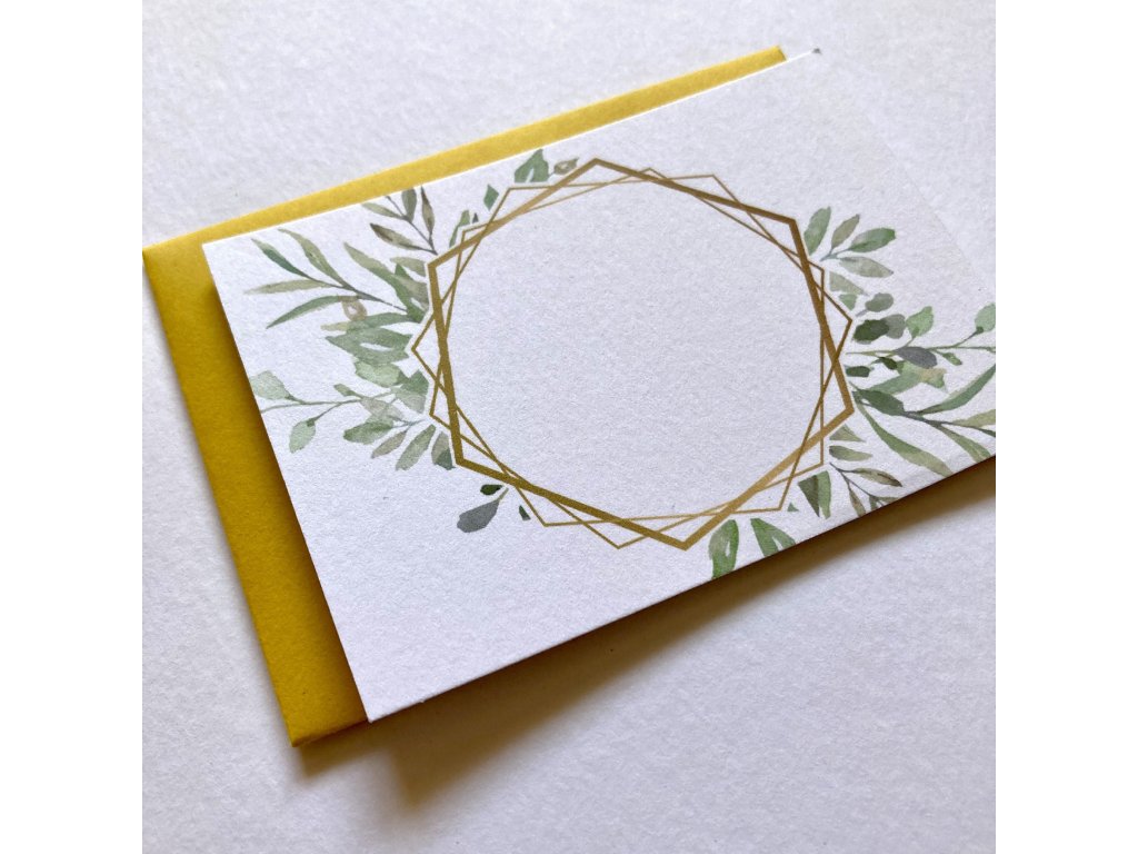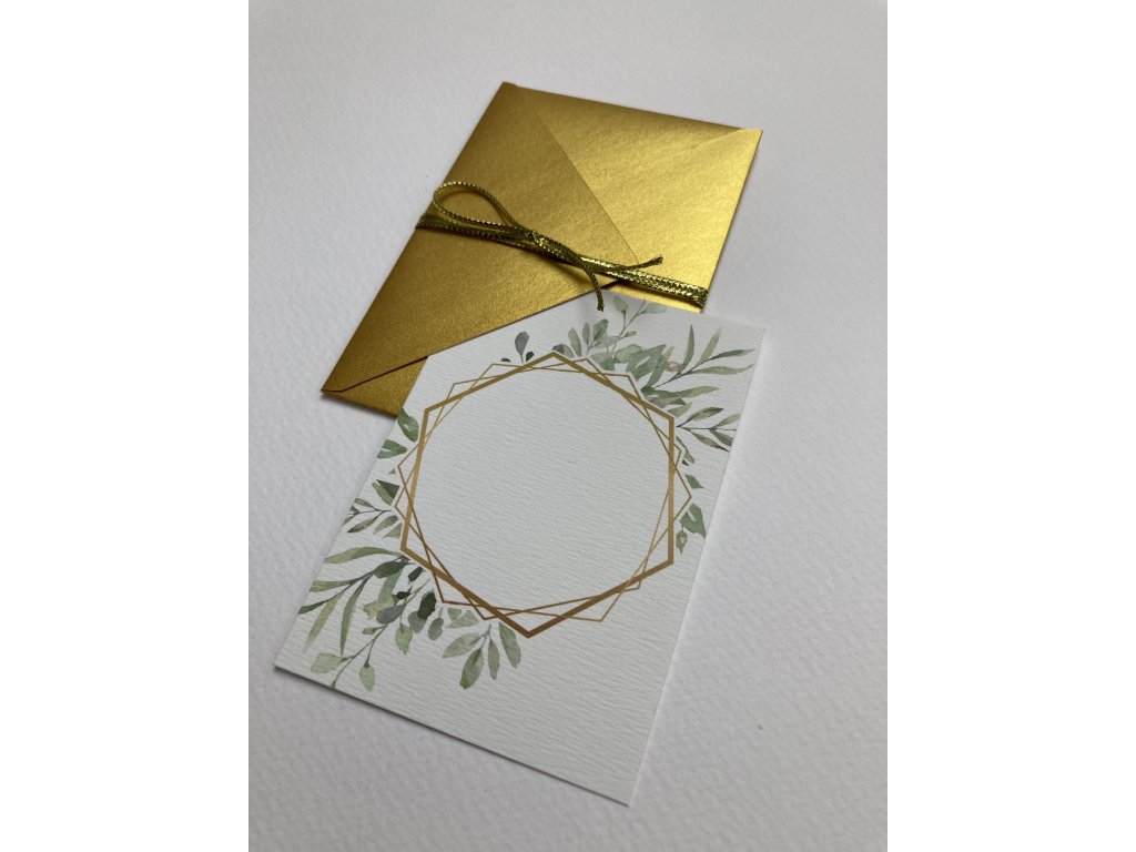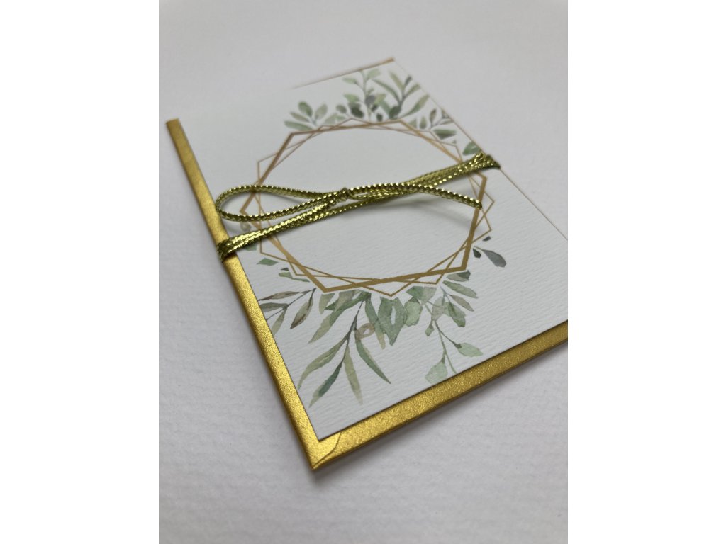 malé přání s motivem zelených lístků olivovníku. Jednoduchá karta s rovnými okraji bez textu, převázaná zlatým provázkem. Barevná obálka.