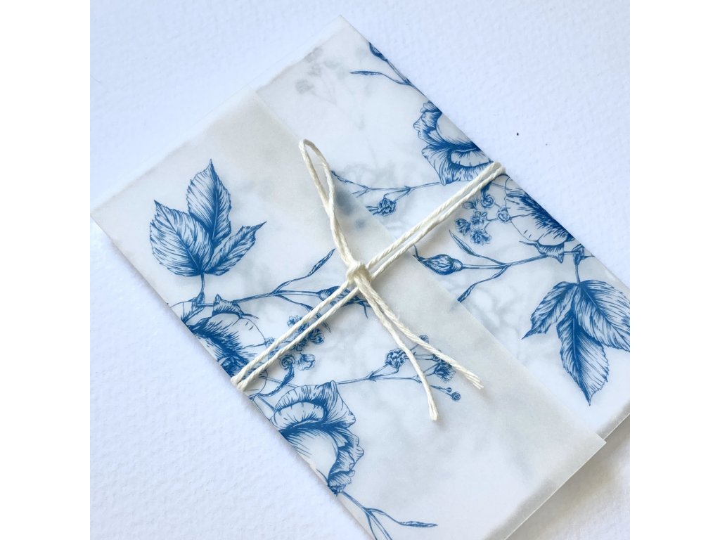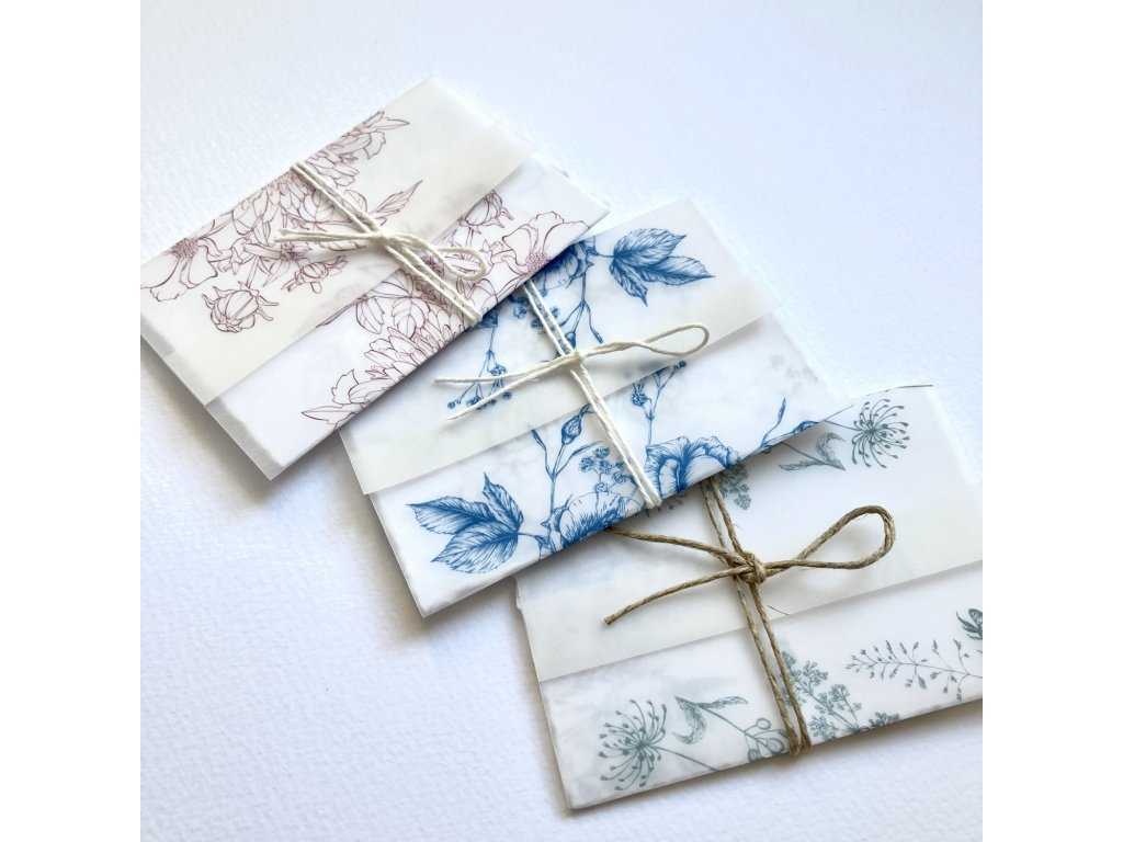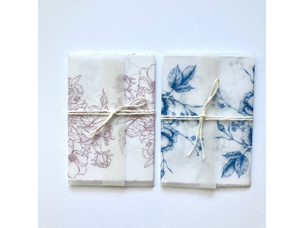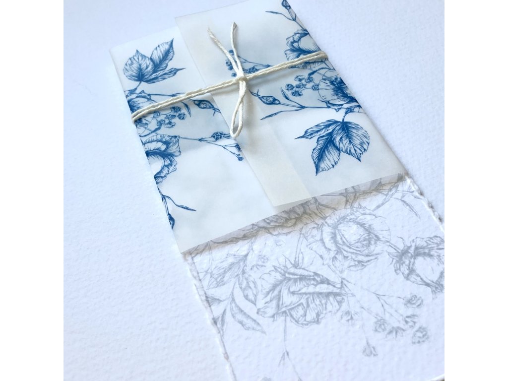 malé přání s motivem růží. Jednoduchá karta s trhanými okraji bez textu, zabalená v potištěné transparentní košilce s provázkem.