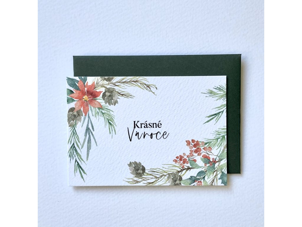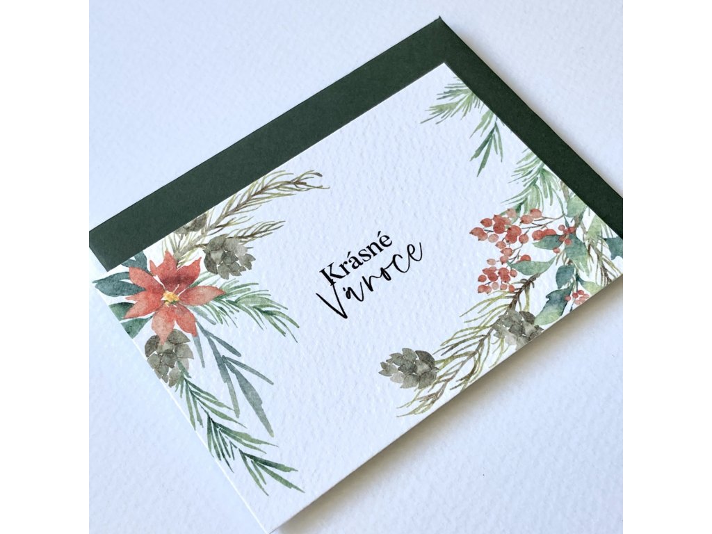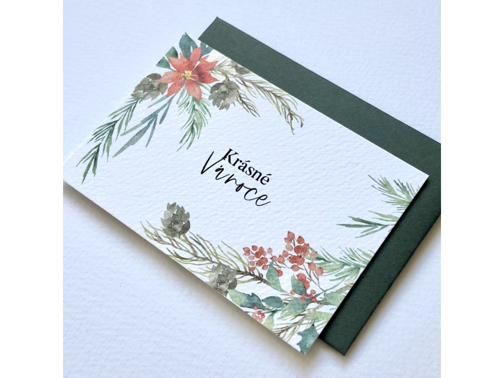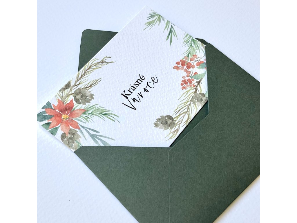 Malé přání s motivem jehličnatých větviček. Jednoduchá karta s rovnými okraji s textem “Příjemné prožití vánočních svátků”. Doplněno o zelenou obálku.