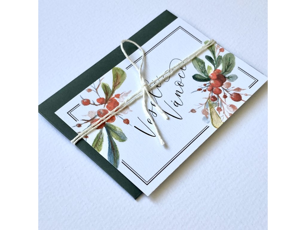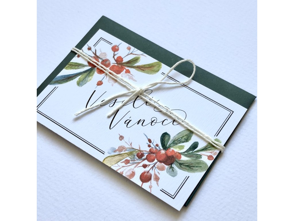 Přání s motivem jmelí. Jednoduchá karta s rovnými okraji s textem “Veselé Vánoce”, převázaná bílým provázkem. Doplněno o barevnou obálku.