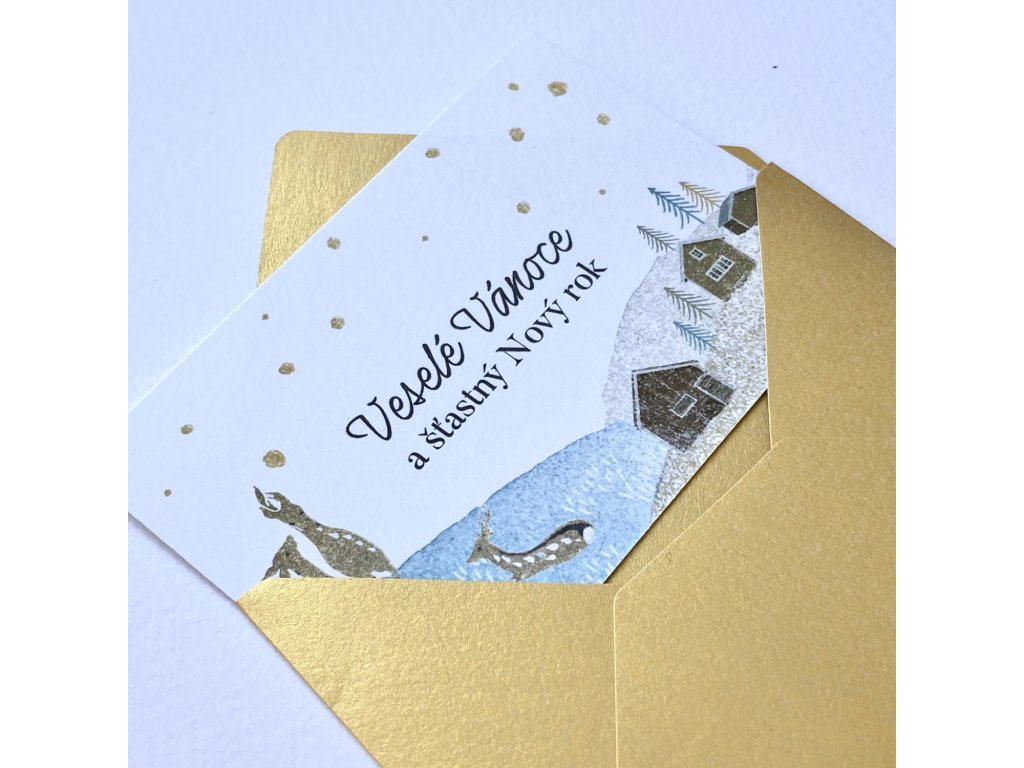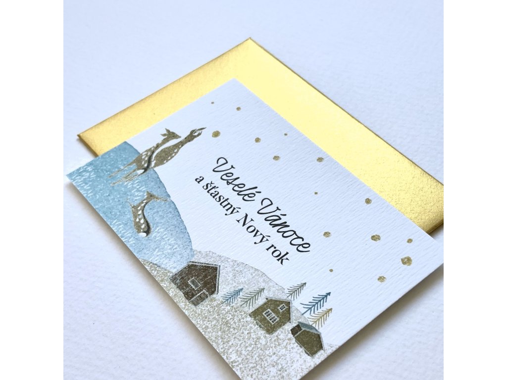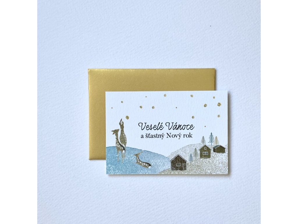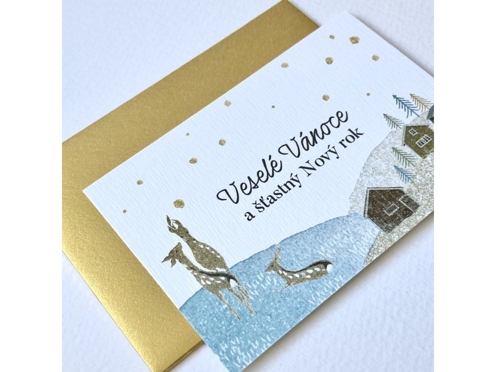 Přání s motivem srnek. Dvojitá karta s rovnými okraji s textem “Veselé Vánoce a šťastný Nový rok”. Doplněno o zlatou obálku.