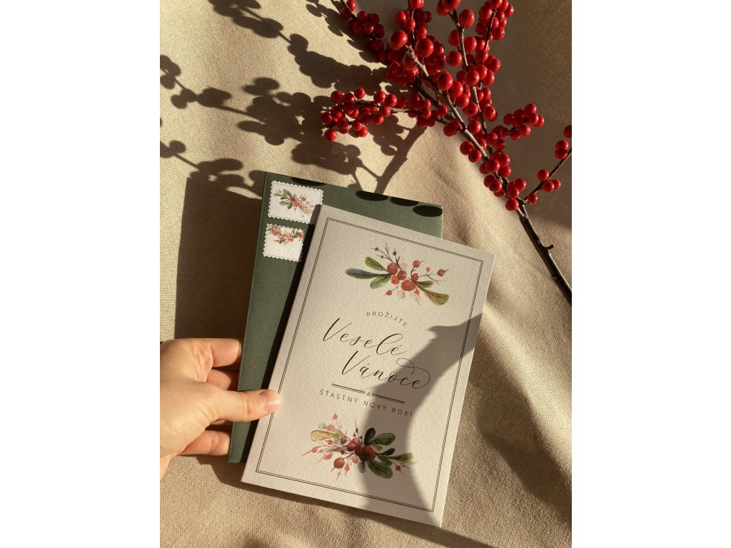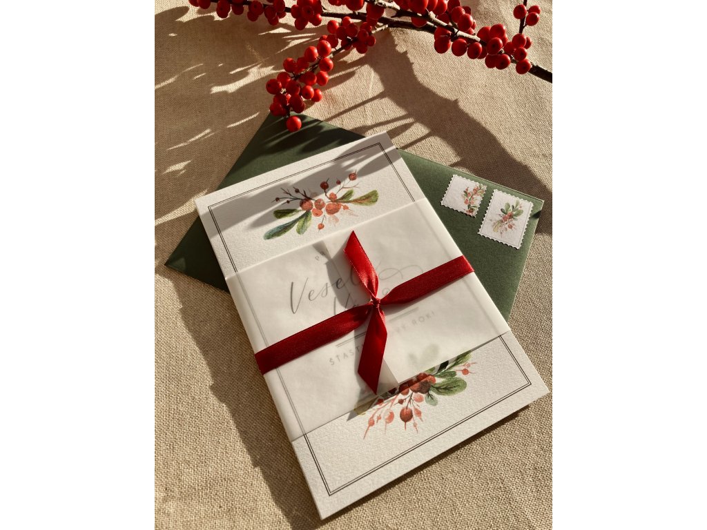 Prémiové přání s motivem jmelí a textem „Prožijte veselé Vánoce a šťastný nový rok“. Dvojitá karta s rovnými okraji je ozdobená okrasnou „košilkou“ a rudou stuhou. Součástí je i tmavě zelená obálka a ladící okrasné známky. Uvnitř je čistý prostor, připravený pro váš osobní vzkaz.