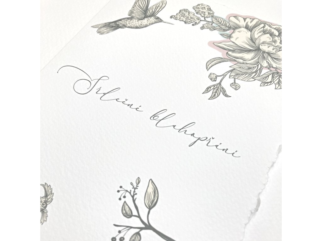 Přání s motivem kolibříků. Dvojitá karta s trhanými okraji s textem “Srdečné blahopřání”, zabalené v transparentní úzké košilce s hedvábnou stuhou. Doplněno o obálku s ozdobnou známkou.