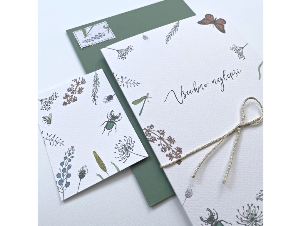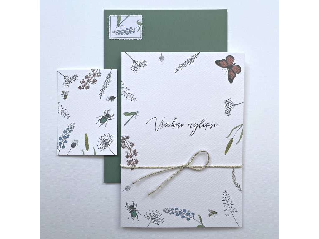 Přání s motivem lučního kvítí a hmyzu. dvojitá karta s textem “Jenom pro tebe ”, s tenkým tmavým provázkem. Doplněno o obálku s ozdobnou známkou.