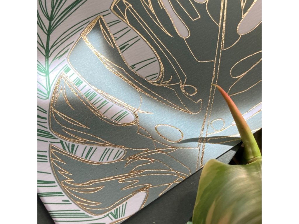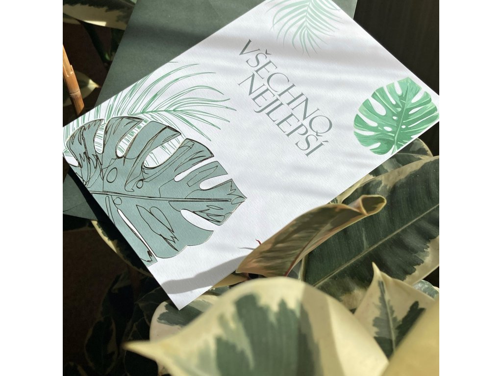 Blahopřání s motivem Monstery. Dvojitá karta s rovnými okraji je doplněná o tmavě zelenou obálku. Uvnitř je čistý prostor, připravený pro váš osobní vzkaz.