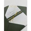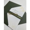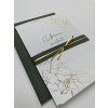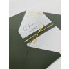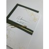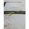 kondolence s motivem orchidejí. Dvojitá karta s rovnými okraji s textem “Upřímnou soustrast”, s papírovým páskem a zlatým provázkem. Tmavě zelená obálka.
