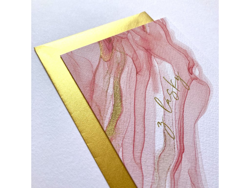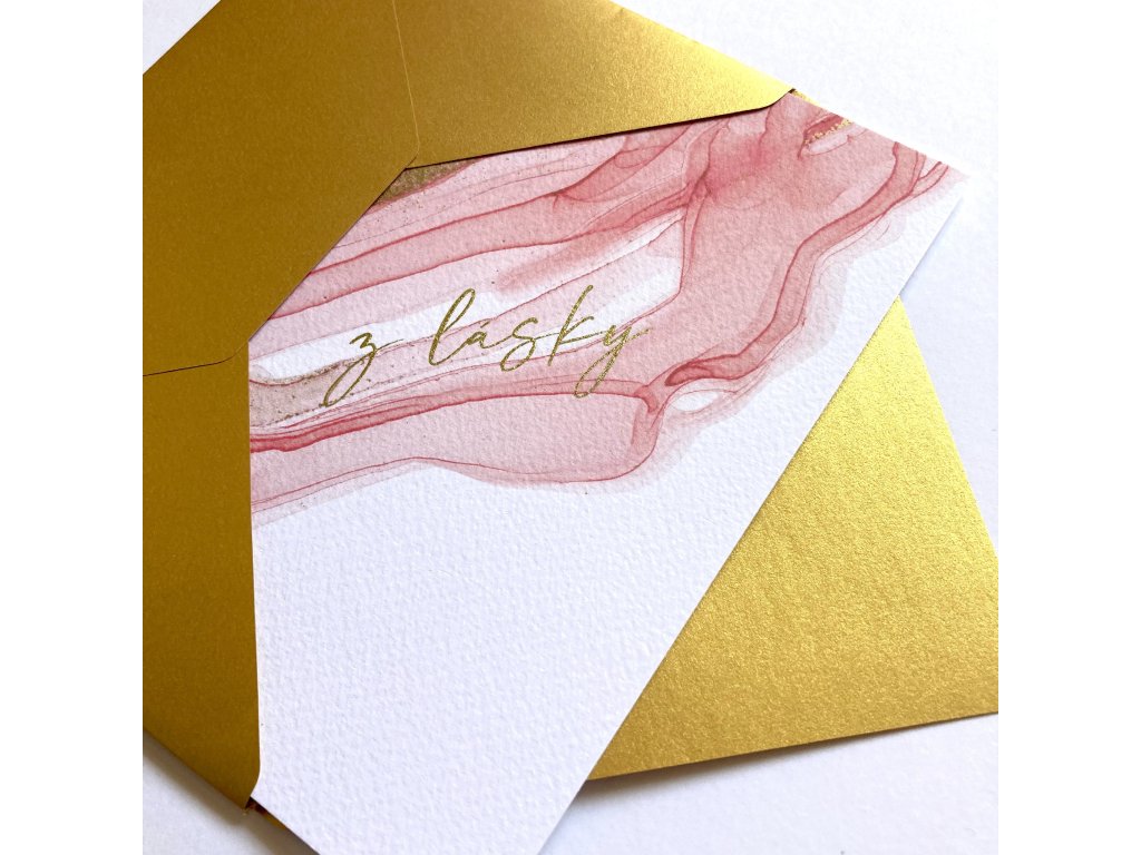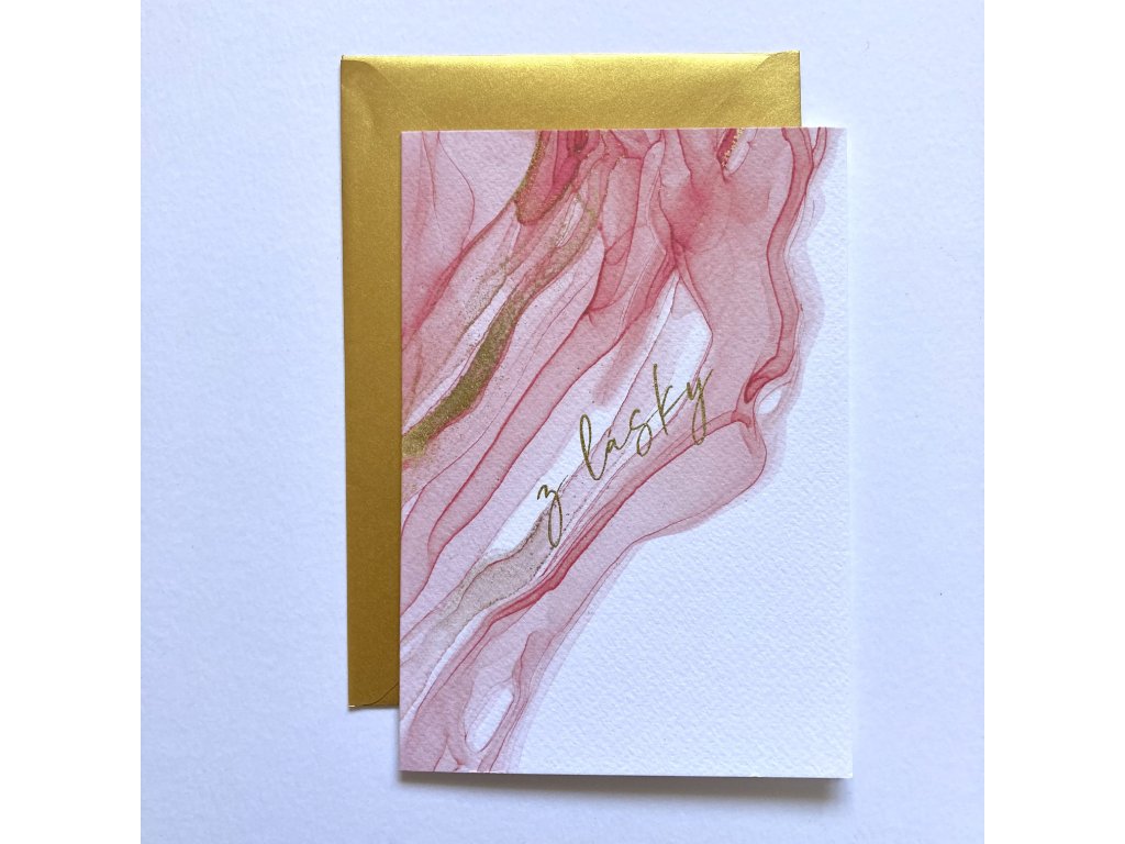 Přání s motivem barevného inkoustu. Dvojitá karta s textem “Z lásky”. Doplněno o zlatou obálku.