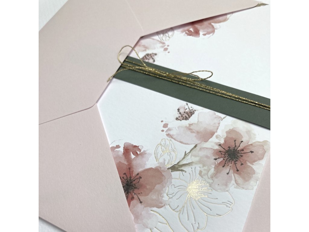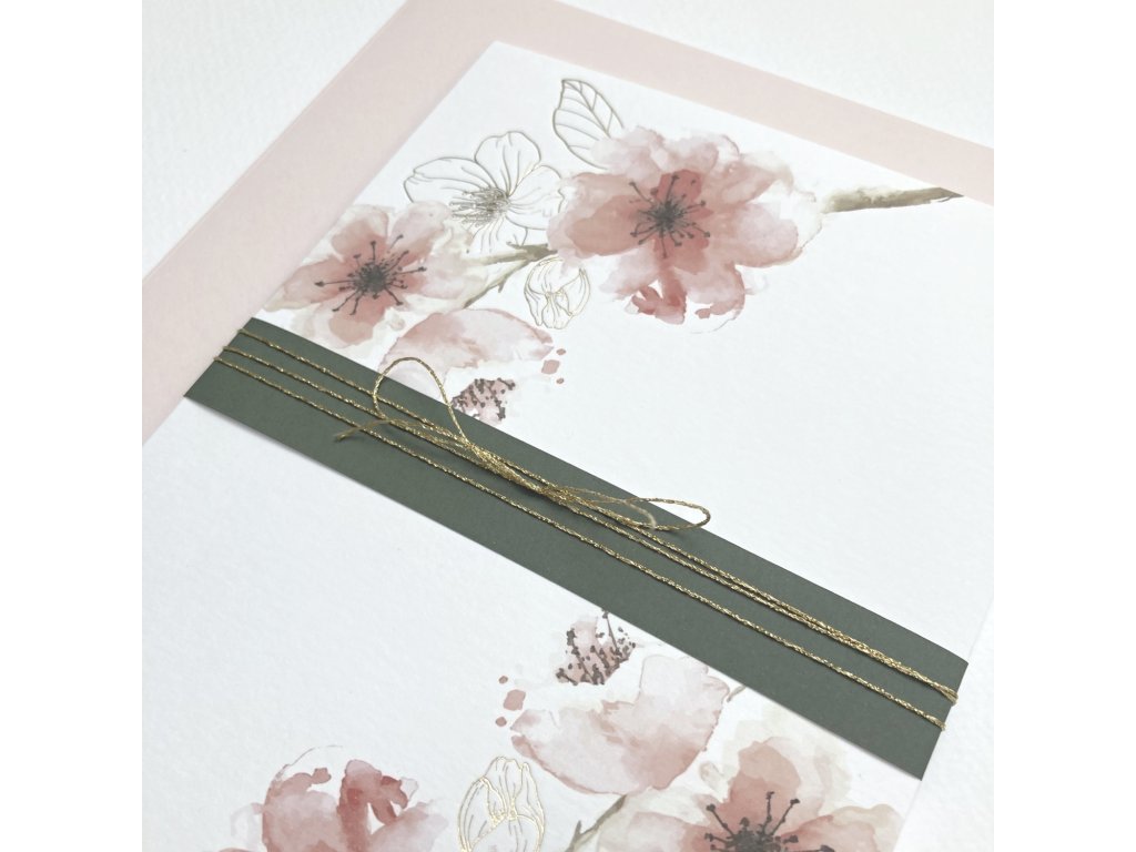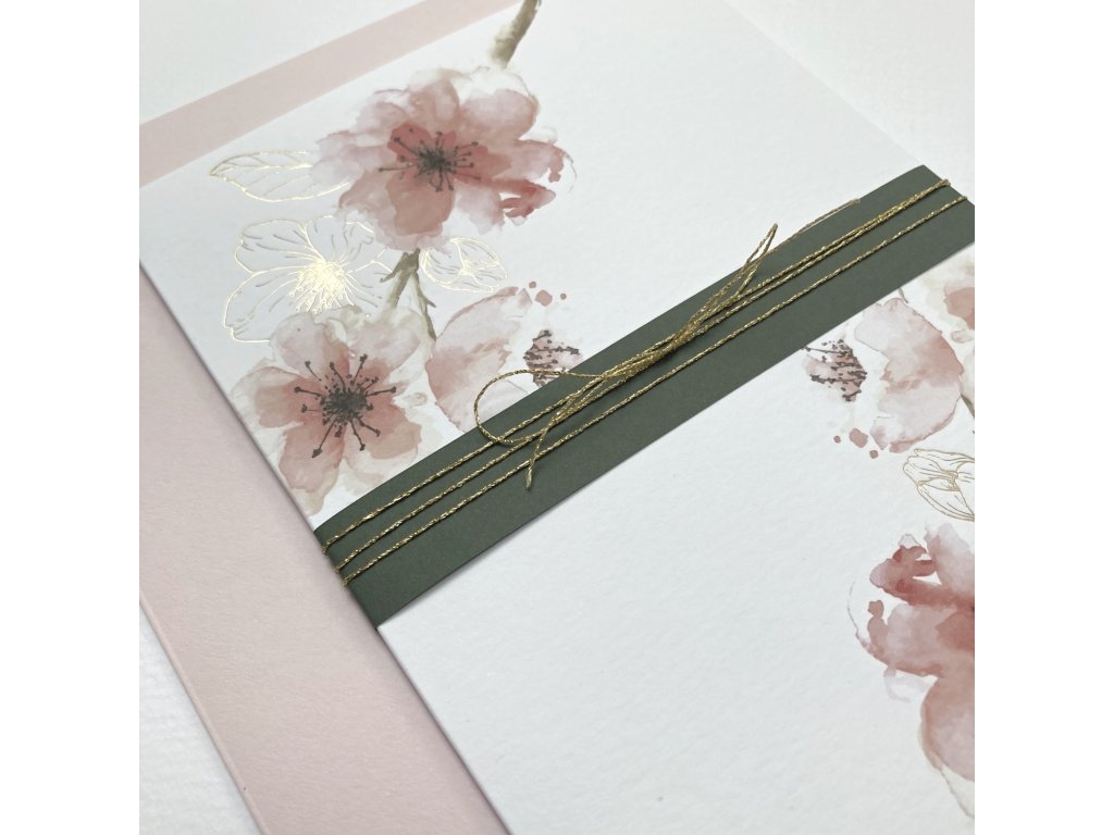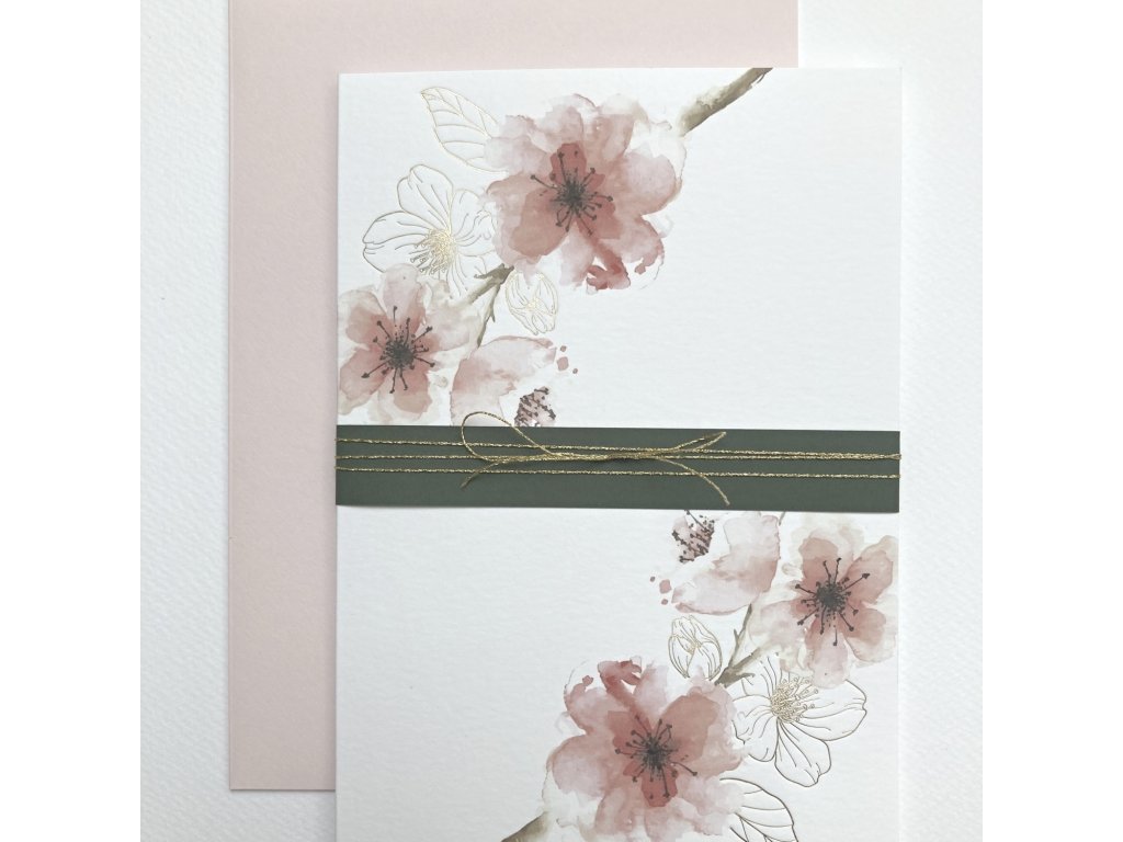 Přání s motivem sakurových květů. Dvojitá karta s rovnými okraji bez textu, s papírovým páskem a zlatým provázkem. Doplněno o světle růžovou obálku s ozdobnými známkami.