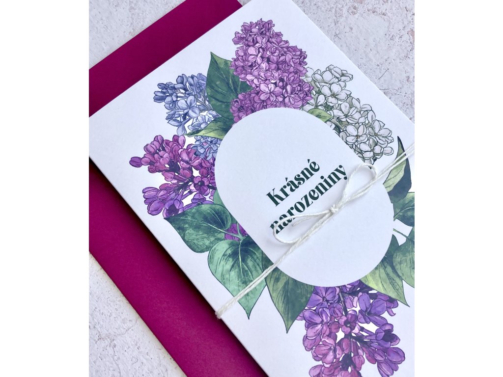 Přání s motivem květin. Dvojitá karta bez textu, s dekorační stuhou. Doplněno o barevnou obálku.