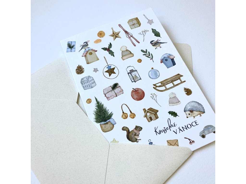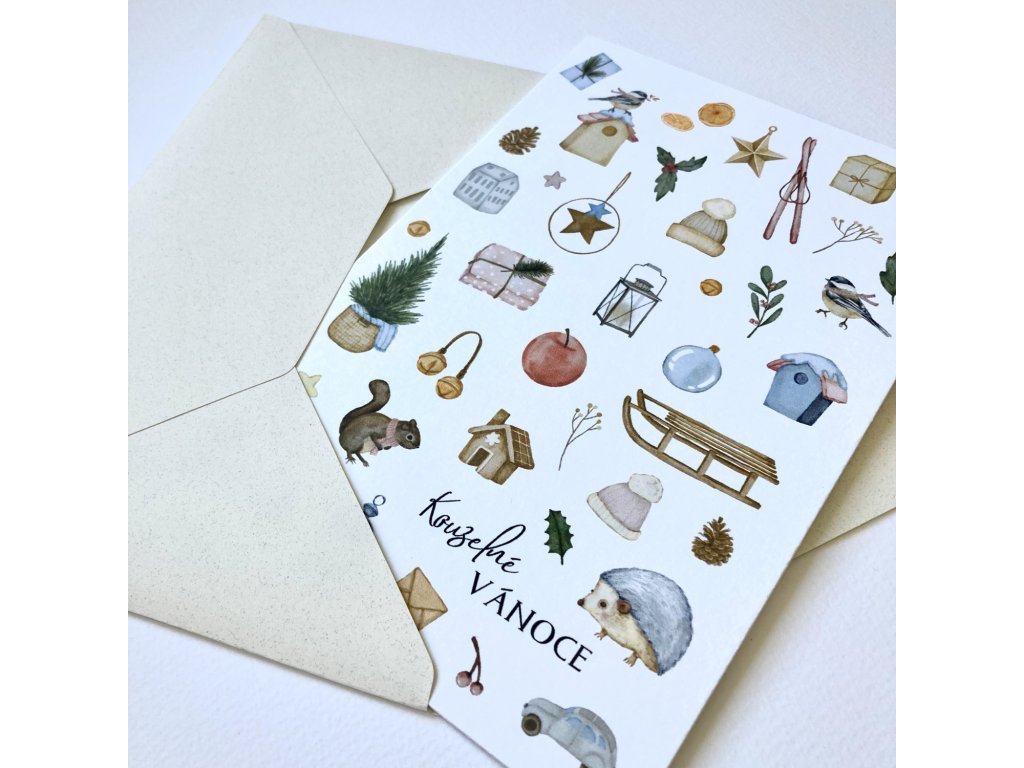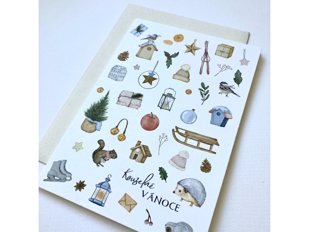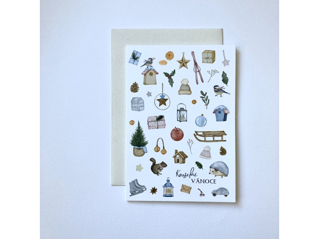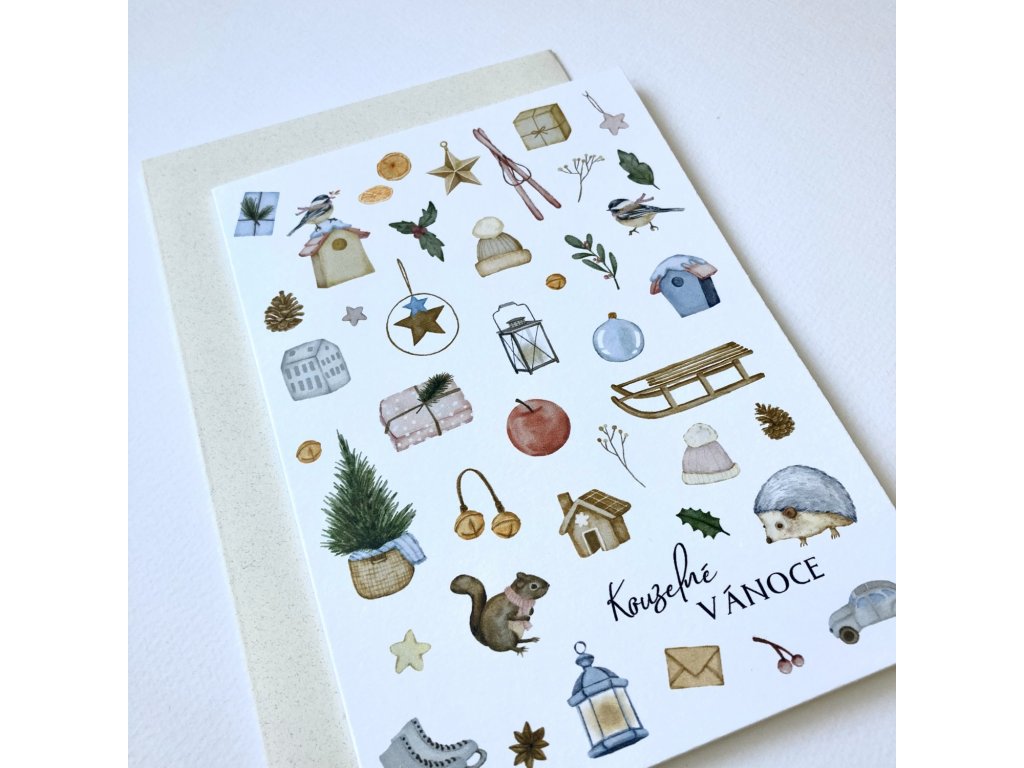 malé přání s motivem ježka a veverky. Jednoduchá karta s rovnými okraji s textem "Kouzelné Vánoce". Barevná obálka.
