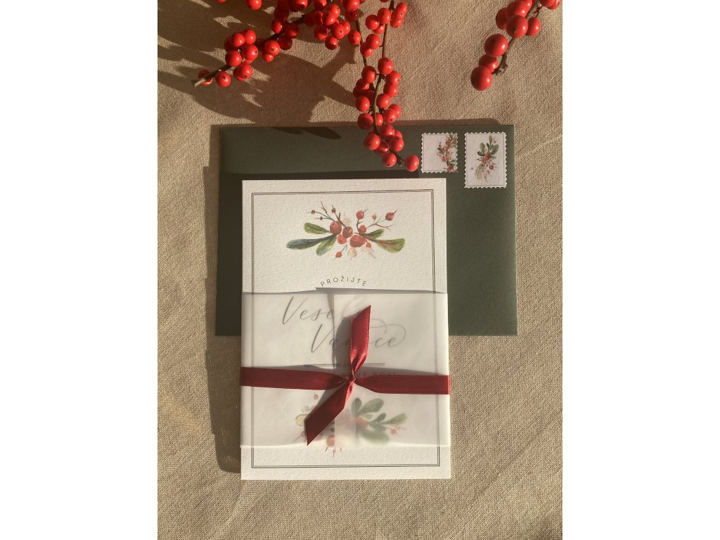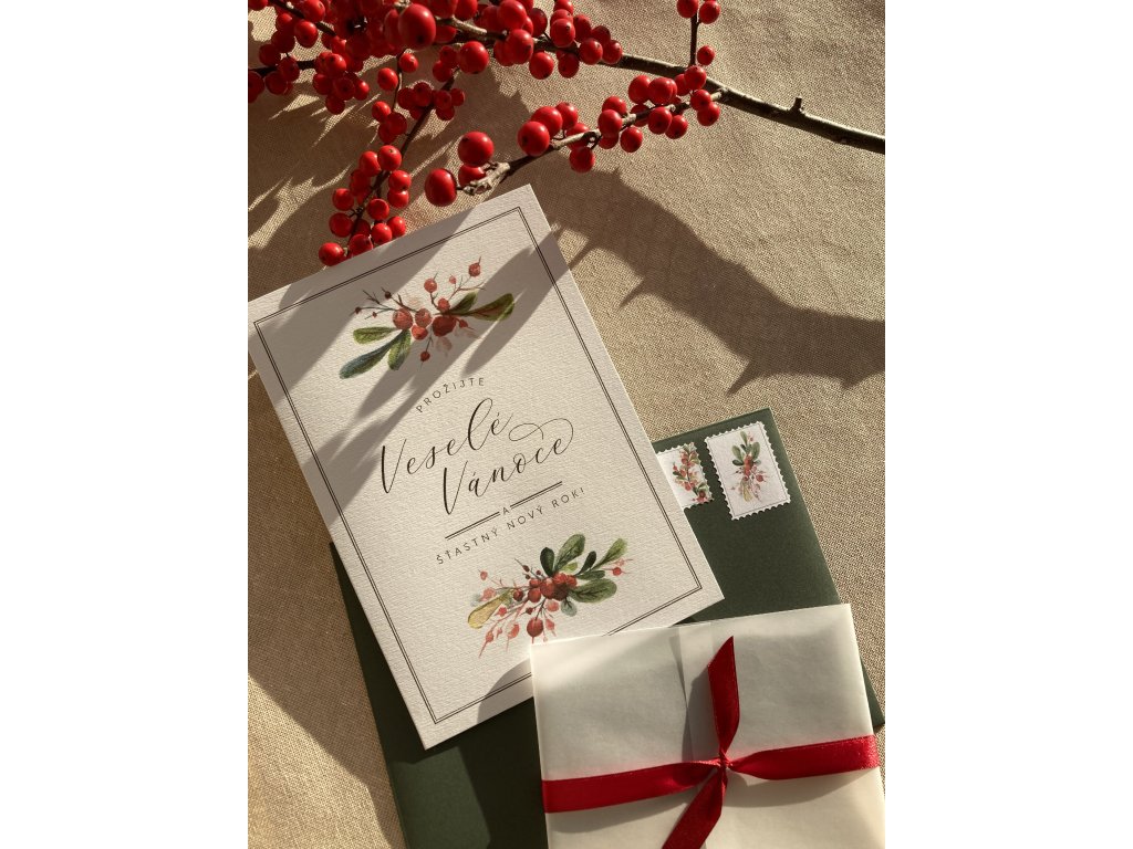 Prémiové přání s motivem jmelí a textem „Prožijte veselé Vánoce a šťastný nový rok“. Dvojitá karta s rovnými okraji je ozdobená okrasnou „košilkou“ a rudou stuhou. Součástí je i tmavě zelená obálka a ladící okrasné známky. Uvnitř je čistý prostor, připravený pro váš osobní vzkaz.