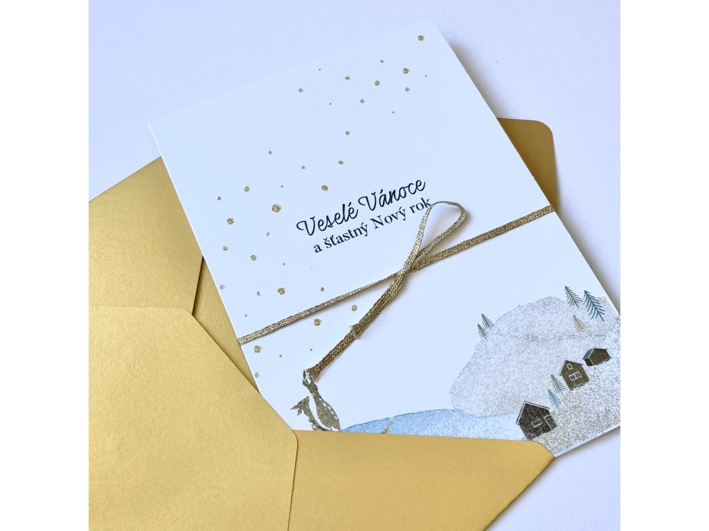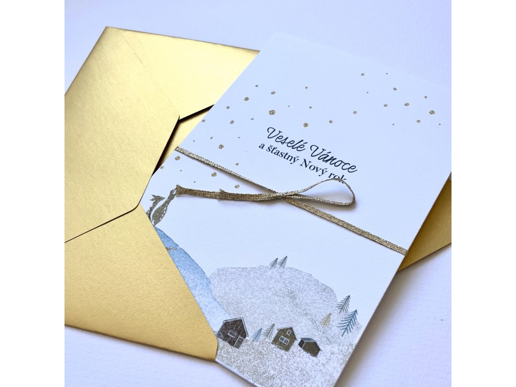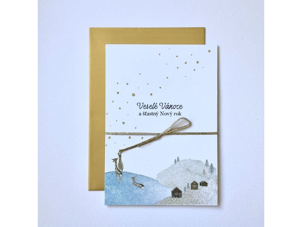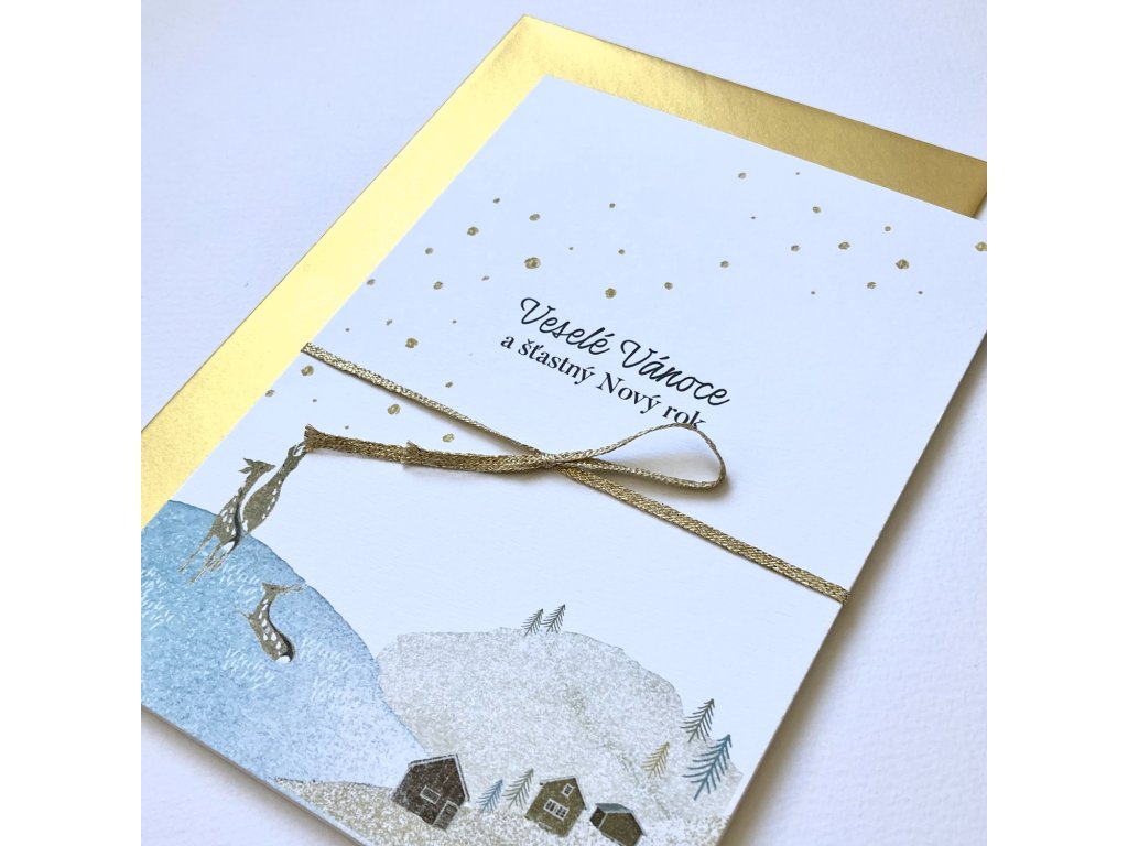 Vánoční přání se srnkami v zasněžené zimní krajině. Dvojitá karta s rovnými okraji se zlatým provázkem a zlatou obálkou. Uvnitř je čistý prostor, připravený pro váš osobní vzkaz.