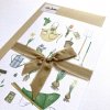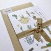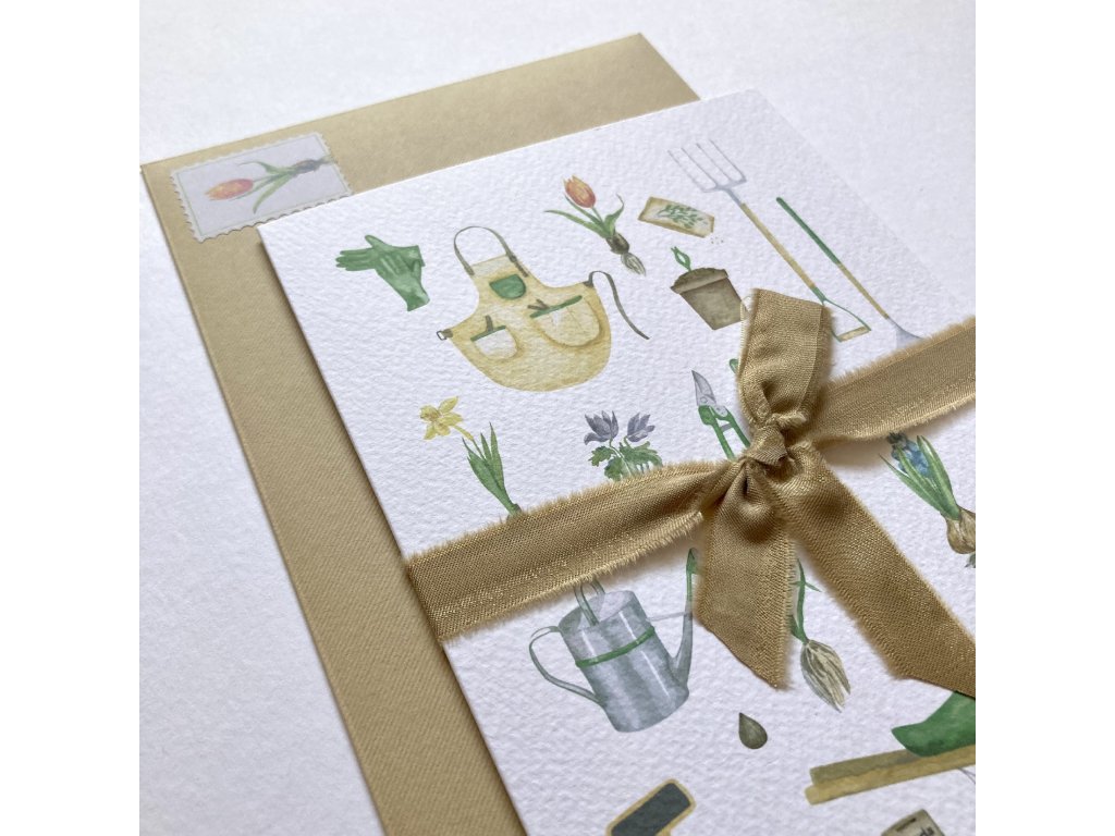 Přání s motivem zahradnických potřeb. Dvojitá karta s rovnými okraji bez textu, převázané hedvábnou stuhou. Doplněno o obálku s ozdobnou známkou.