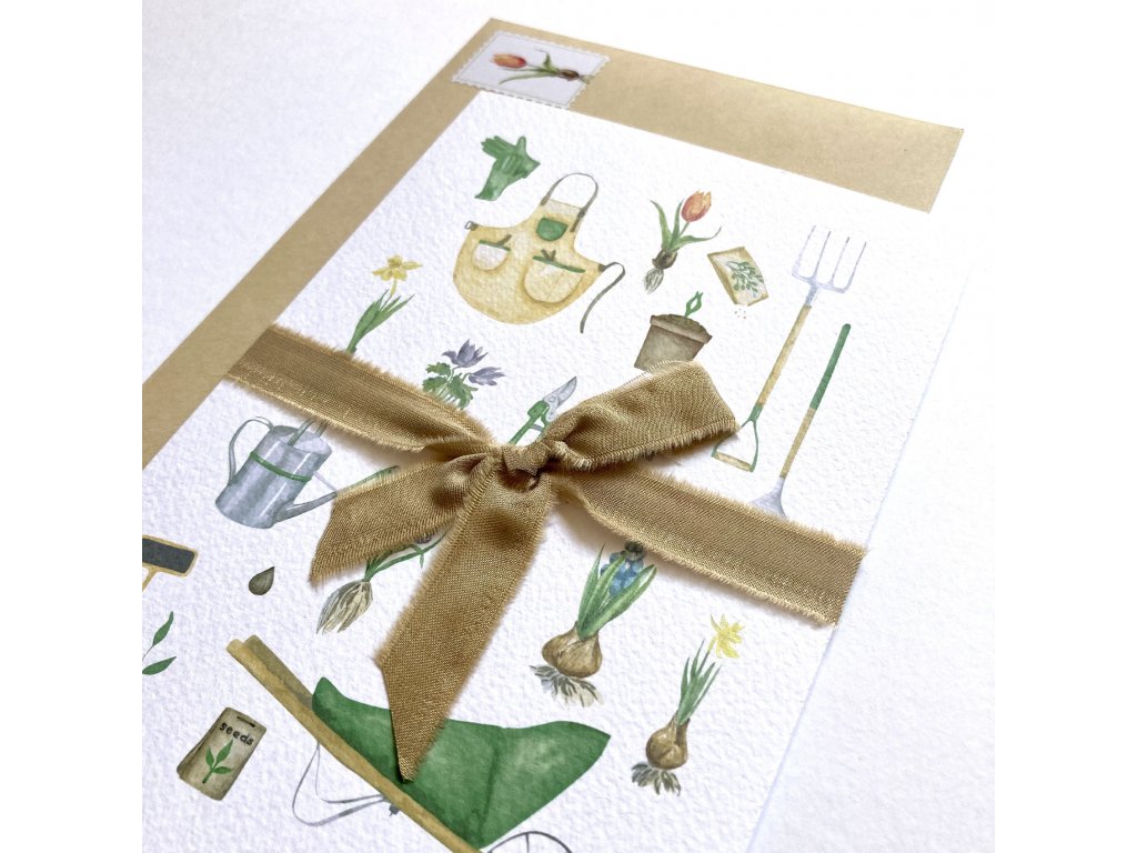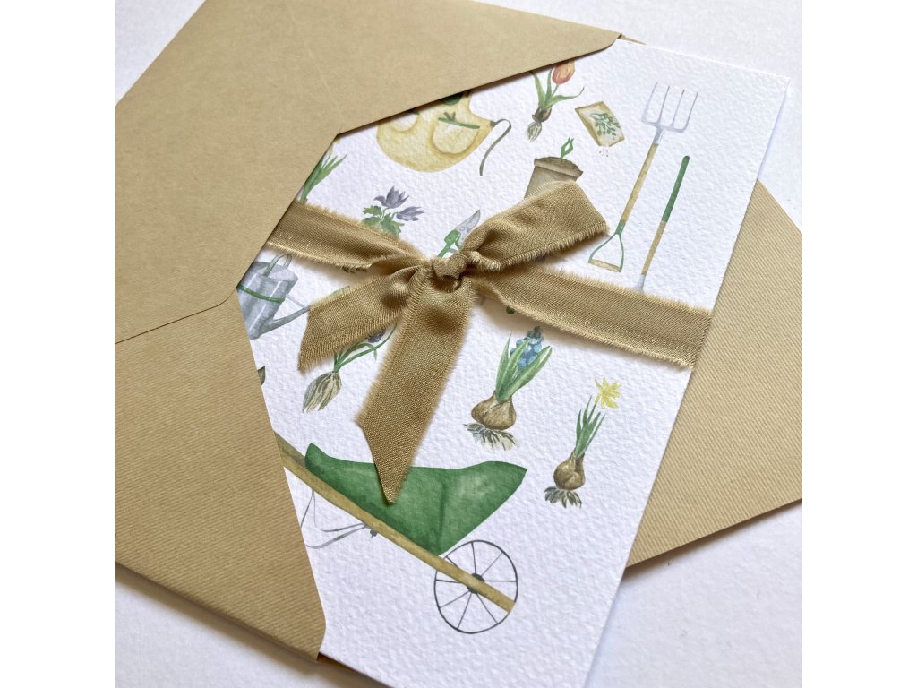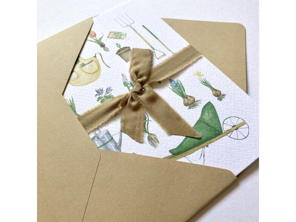 Přání s motivem zahradnických potřeb. Dvojitá karta s rovnými okraji bez textu, převázané hedvábnou stuhou. Doplněno o obálku s ozdobnou známkou.