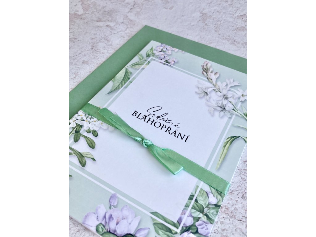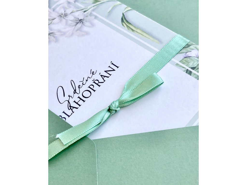 Přání s motivem květin. Dvojitá karta bez textu, s dekorační stuhou. Doplněno o barevnou obálku.