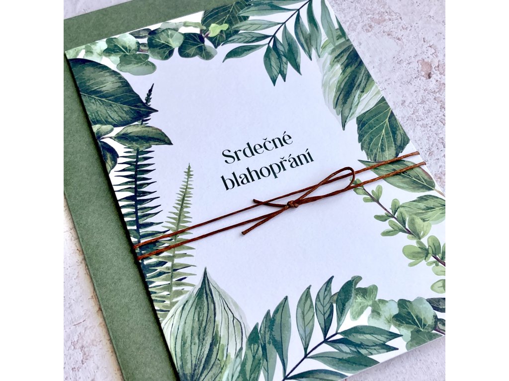 Krása listí zachycena na elegantním přání. Dvojitou kartu doplňuje kontrastní tmavý provázek a zelená obálka v odstínu kapradiny. Uvnitř je čistý prostor, připravený pro váš osobní vzkaz.