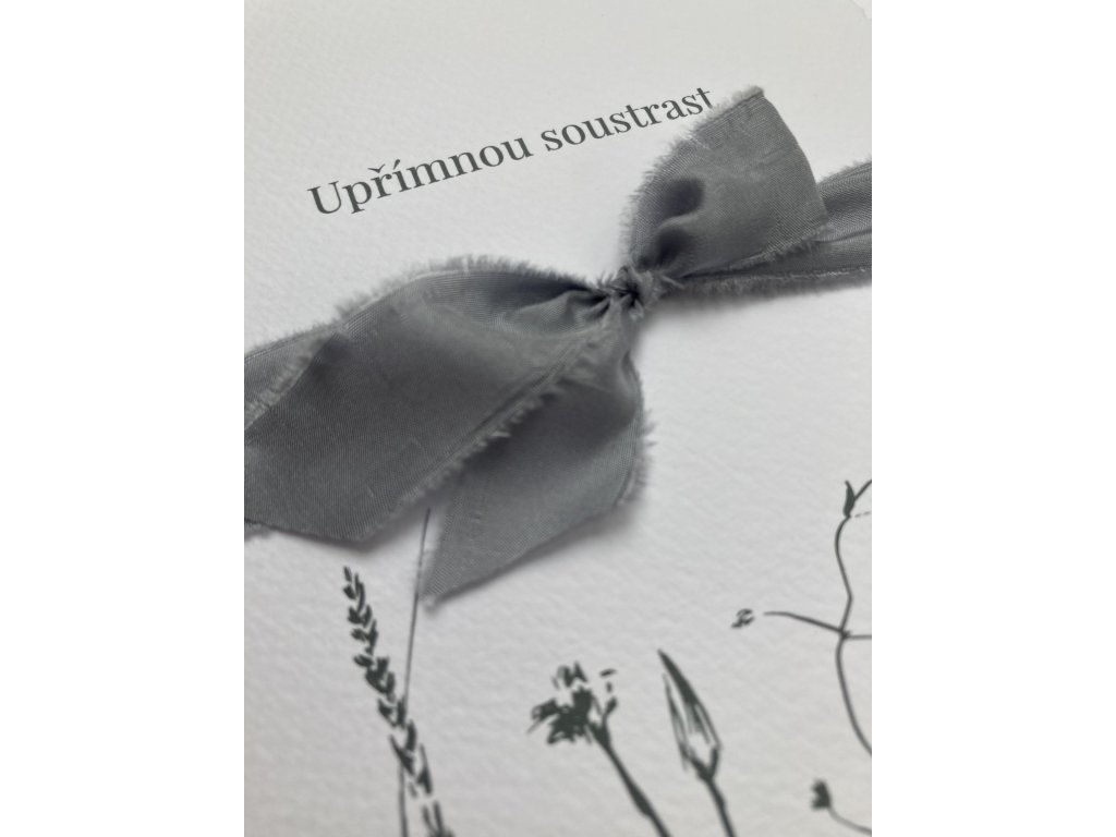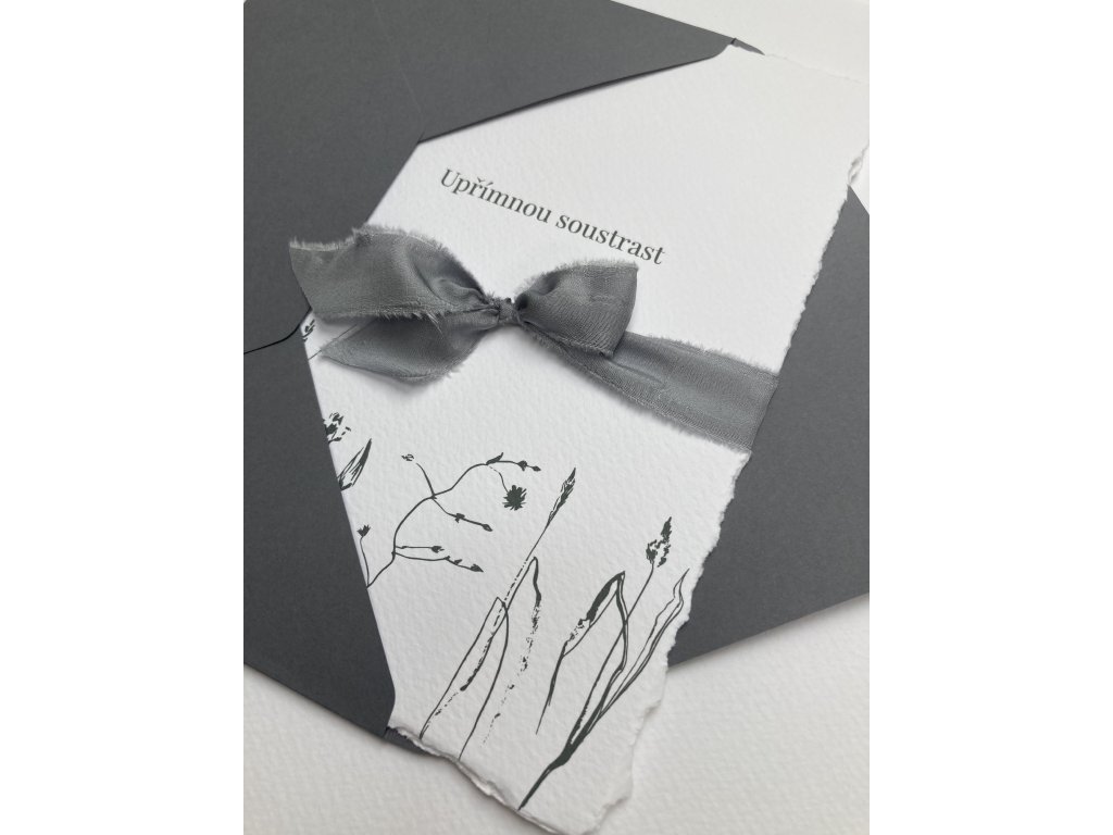 Kondolence s motivem travin. Dvojitá karta s trhanými okraji s textem “Upřímnou soustrast”, ovázaná hedvábnou stuhou. Šedomodrá obálka.
