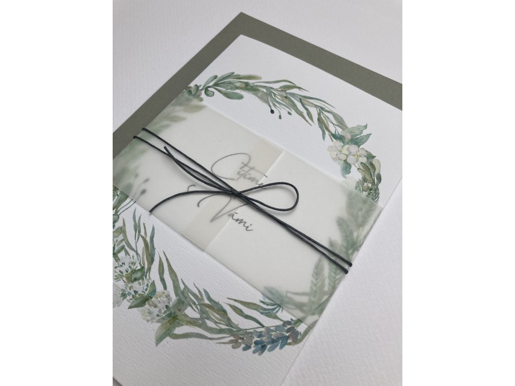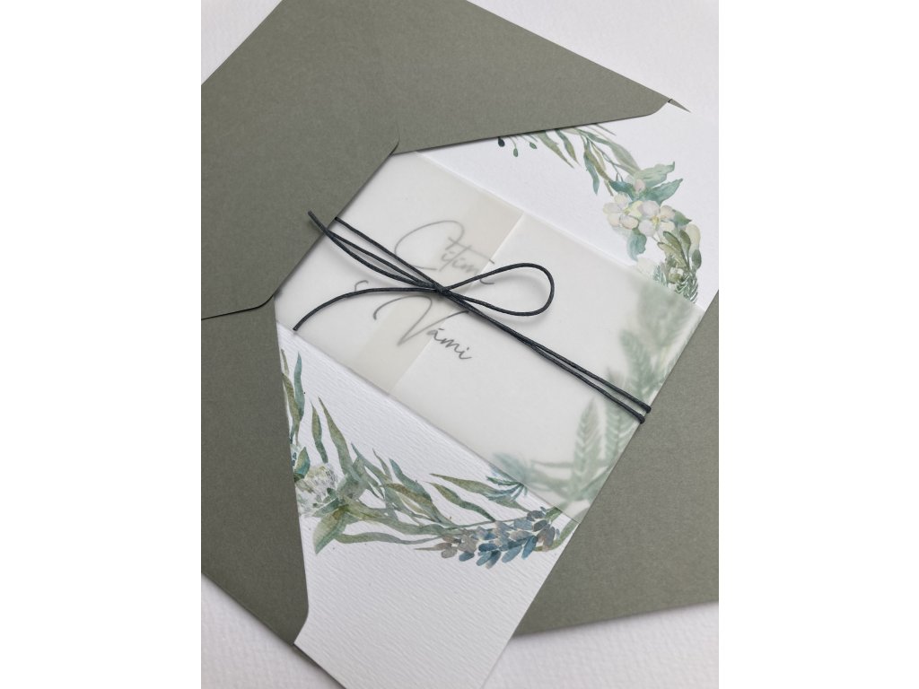 Kondolence s motivem věnce z olivových lístků. Dvojitá karta s rovnými okraji s textem “Cítíme s vámi”, zabalená v transparentní úzké košilce s šedým provázkem. Světle šedá obálka.